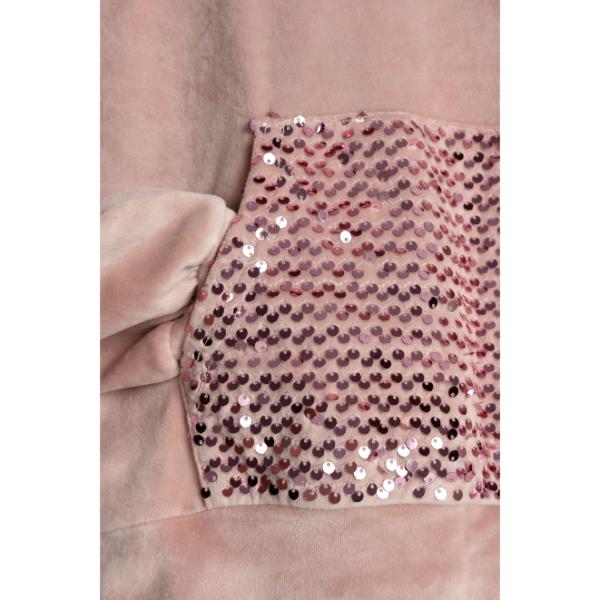 Σετ φόρμες βελούδινες για κορίτσι από 6 ως 16 ετών, σε χρώμα ροζ. Μπλούζα με κουκούλα και τσέπη μπροστά. Παγιέτα στη κουκούλα και τη τσέπη.