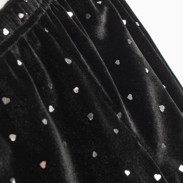 Σετ φόρμες, βελουτέ, για κορίτσι από 2 έως 6 ετών. Μπλούζα σε μαύρο χρώμα, με τύπωμα καρδούλες και κονκάρδα αρκουδάκι. Παντελόνι καμπάνα, σε μαύρο χρώμα, με λάστιχο στη μέση.