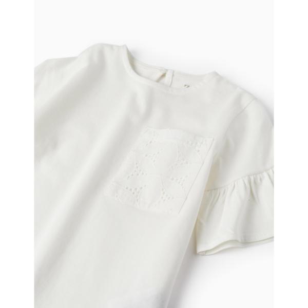 Σετ για κορίτσι μπλούζα-παντελόνα σε χρώμα λευκό-κεραμιδί. Λευκό κοντομάνικο μπλουζάκι, 100% βαμβάκι. Μπροστινή τσέπη με κεντημένες λεπτομέρειες. Βολάν στα μανίκια για πιο ντελικάτη πινελιά. Δένει στο πίσω μέρος με κουμπί για εύκολο ντύσιμο.Κεραμιδί παντελόνι από 100% ύφασμα lyocell. Ελαστική μέση με διακοσμητικό φιόγκο μπροστά και λάστιχα και ρυθμιζόμενα κουμπιά στο εσωτερικό. Παντελόνι σε στυλ ‘Wide Leg’.