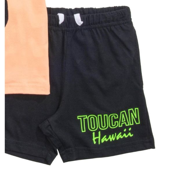 Σετ μακό για αγόρι από 1 έως 6 ετών, μπλουζάκι σε σομόν χρώμα με τύπωμα παπαγάλο και βερμούδα σε μαύρο χρώμα.