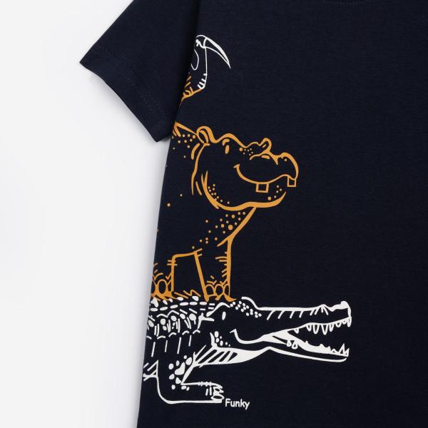 Σετ μακό για αγόρι από 2 έως 6 ετών. Μπλούζα κοντομάνικη, σε χρώμα σκούρο μπλε, με τύπωμα μπροστά ζωάκια. Βερμούδα σε χρώμα ginger.