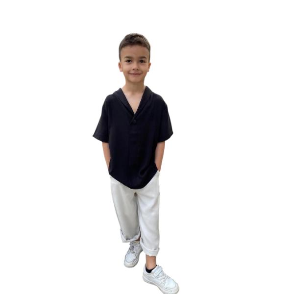Σετ δύο τεμαχίων για αγόρια, 100% viscose. Μπλούζα κοντομάνικη, τύπου πουκαμίσα, αέρινη, σε μαύρο χρώμα. Παντελόνι μακρύ, αέρινο, σε μπεζ χρώμα, με λάστιχο στη μέση και τσέπες.