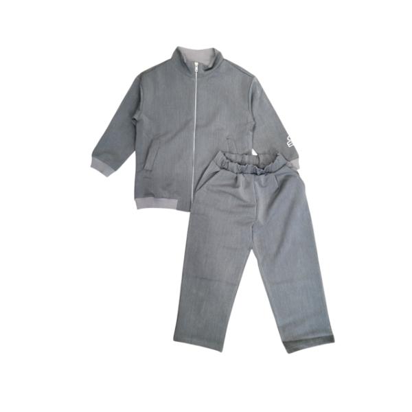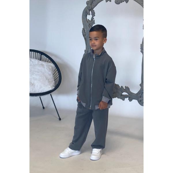 Τζάκετ, τύπου bomber, υφασμάτινo, σε γκρι χρώμα με ημίψηλο γιακά, τσέπες και φερμουάρ. Παντελόνι υφασμάτινο, σε γκρι χρώμα, με λάστιχο στη μέση. Ένα κοστούμι, κατάλληλο να φορεθεί όλες τις εποχές.