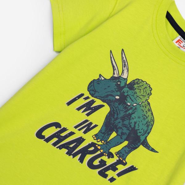 Σετ μακό για αγόρι από 2 έως 6 ετών. Μπλούζα κοντομάνικη, σε χρώμα λαχανί, με τύπωμα δεινόσαυρο και βερμούδα πικέ σε χρώμα μπλε.