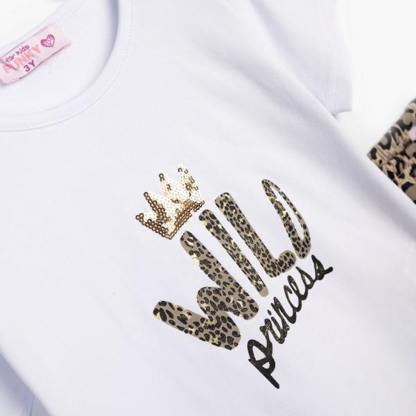 Σετ μακό μπλούζα-κολάν κάπρι για κορίτσι από 1 έως 6 ετών. Μπλούζα κοντομάνικη σε λευκό χρώμα με τύπωμα μπροστά και στέμμα με παγιέτα χρυσή. Κολάν κάπρι σε χρώμα μόκα με ολόσωμο τύπωμα animal print.