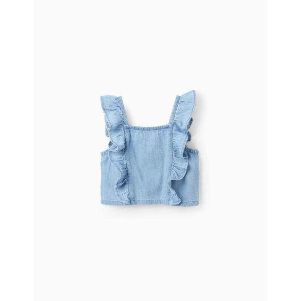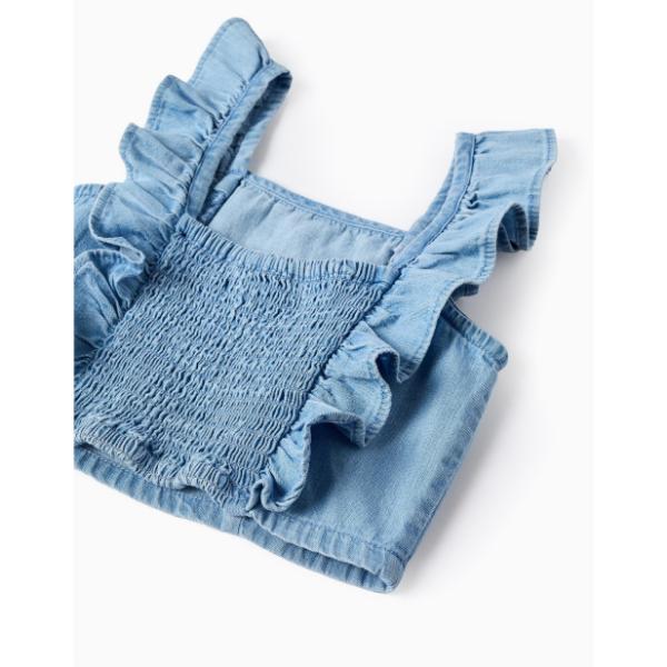 Σετ τζιν σορτς για κορίτσι σε χρώμα μπλε. Μπλουζάκι, με βολάν. Ελαστικό πάνελ στο πίσω μέρος για τέλεια εφαρμογή. Ένα μοντέρνο και θηλυκό κομμάτι! Σορτς, 100% βαμβάκι. Ελαστική μέση με φούτερ, ρυθμιζόμενη εσωτερικά με λάστιχα και κουμπιά. Απαλό, άνετο και θηλυκό!