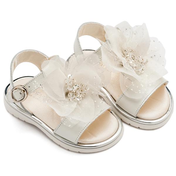 Δερμάτινο Πέδιλο με Χειροποίητο Λουλούδι από Τούλι σε Εκρού Χρώμα.