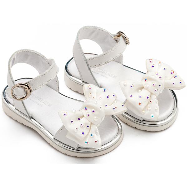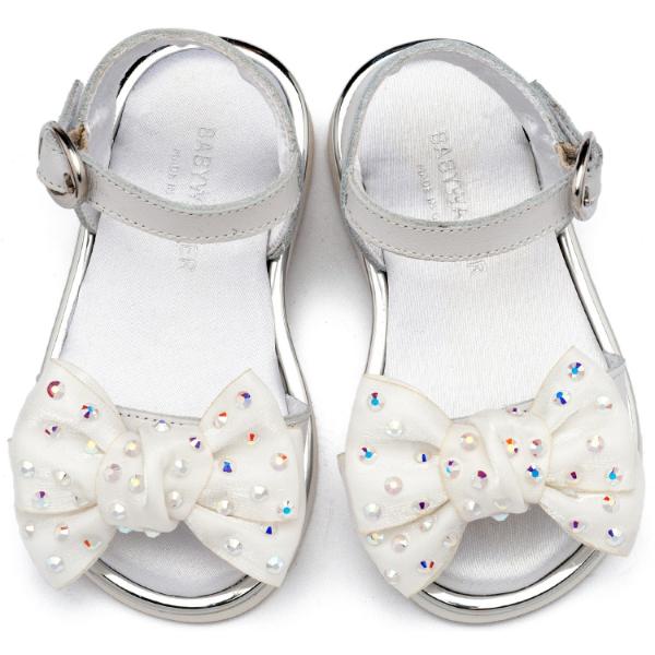 Δερμάτινο Πέδιλο με Φιόγκο Οργάντζας και Στρας Swarovski σε λευκό χρώμα.