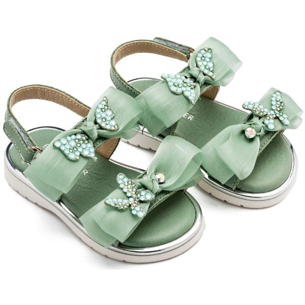 Δερμάτινο Πέδιλο με Φιόγκους Οργάντζας και Πεταλούδες Swarovski σε Μέντα Χρώμα.
