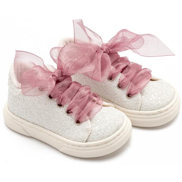 Sneaker από Ύφασμα Glitter με Κορδέλα Οργάντζα σε Λευκό Ροζ Αντικέ Χρώμα.