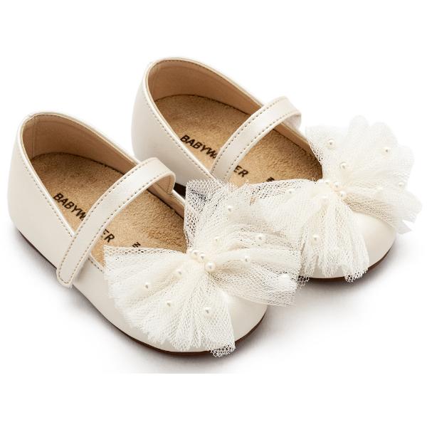 Δερμάτινο γοβάκι με τούλινο χειροποίητο φιόγκο και πέρλες, σε εκρού χρώμα.