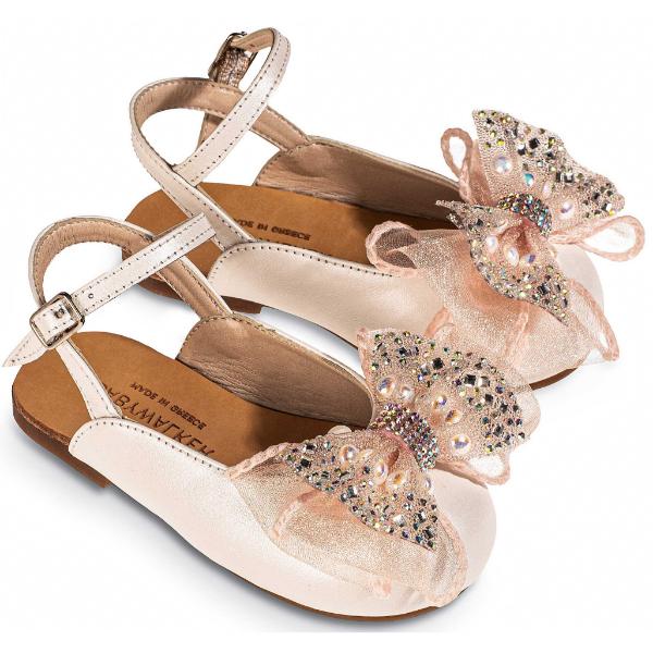 Δερμάτινο γαλλικό σαμπό με φιόγκο οργάντζας και strass σε εκρού-ροζ χρώμα.
