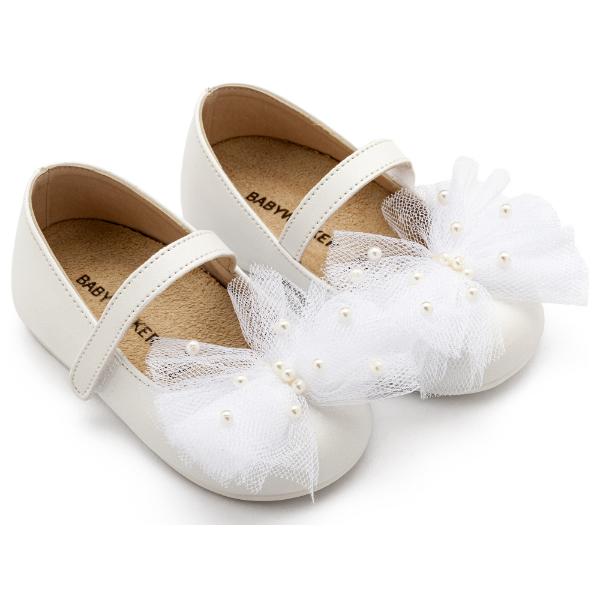 Δερμάτινο γοβάκι με τούλινο χειροποίητο φιόγκο και πέρλες, σε λευκό χρώμα.