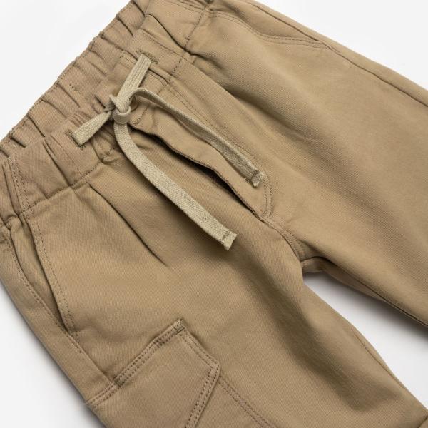 Βερμούδα σταθερή, για αγόρι από 2 έως 6 ετών σε χρώμα σκούρο μπεζ. Κουμπί και κορδόνι στη μέση, τσέπη στο πλάι.