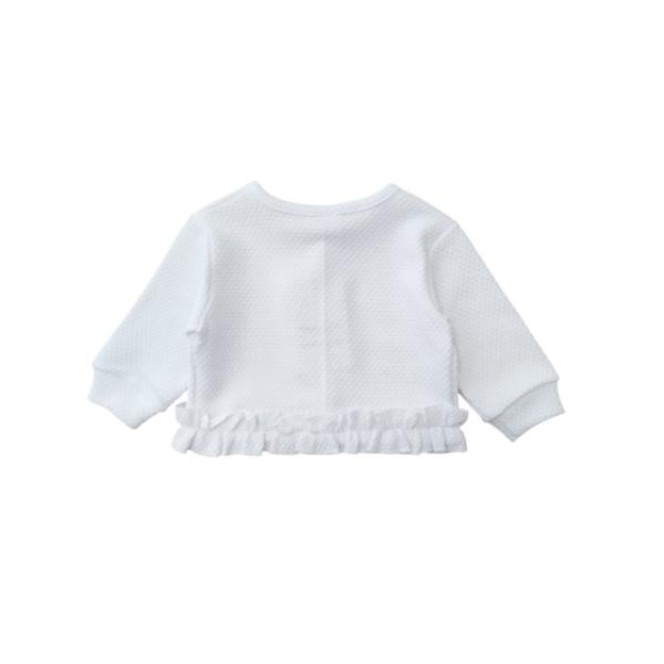 Ζακέτα με λεπτή πλέξη για κορίτσι σε χρώμα λευκό με κουμπάκια και βολάν στο τελείωμα.