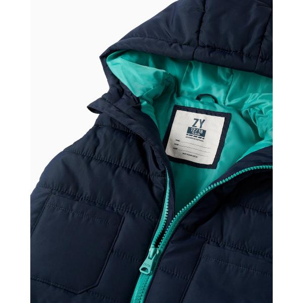 Μπλε γιλέκο με κουκούλα με επένδυση για αγοράκια, με τιρκουάζ λεπτομέρειες. Κλείσιμο με φερμουάρ για εύκολο ντύσιμο. Δύο μπροστινές τσέπες. Ετικέτα μέσα για να βάλετε την ταυτότητα του παιδιού.