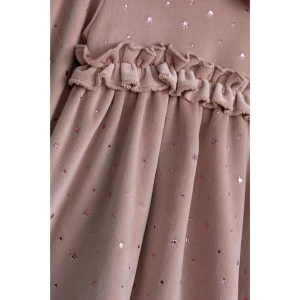 Βρεφικό φόρεμα για κορίτσι από 6 ως 24 μηνών,βελουτέ σε χρώμα ροζ πούδρας, με ολόσωμο τύπωμα αστεράκια, λάστιχο στα μανίκια, βολάν στη μέση και γιακά.