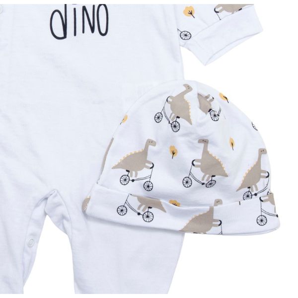Φορμάκι μ/μ λευκό με τύπωμα δεινάσαυρους+σκουφάκι λευκό με τύπωμα δεινόσαυρους. Ποιότητα 100% cotton.