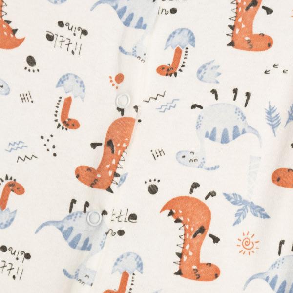 Φορμάκι μακρυμάνικο για αγόρι βρεφανάπτυξη, σε χρώμα λευκό, με ολόσωμο τύπωμα δεινοσαυράκια.