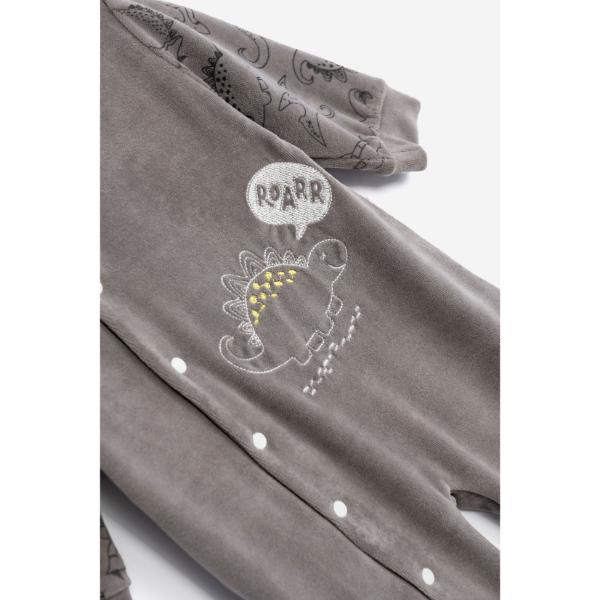 Βρεφικό φορμάκι βελουτέ, για αγόρι σε γκρι χρώμα με τύπωμα δεινοσαυράκια μπροστά και στα μανίκια.
