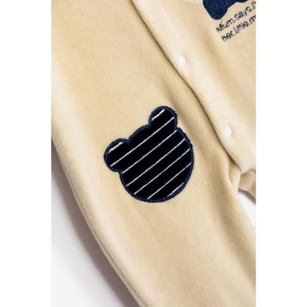 Βρεφικό φορμάκι βελουτέ, για αγόρι σε χρώμα μπεζ με μπλε και σχέδιο με αρκουδάκι μπροστά.