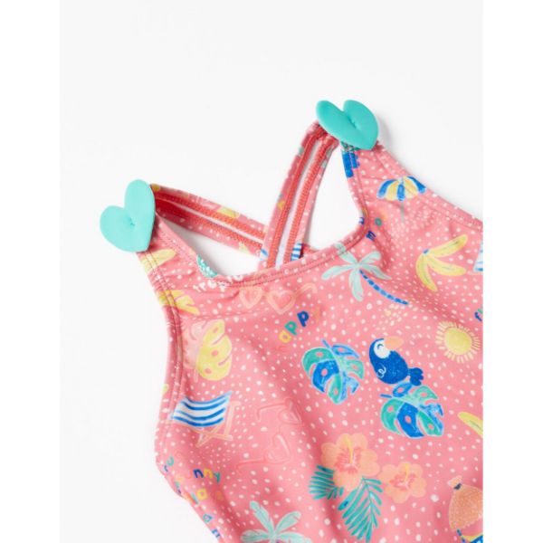 Κοραλί μαγιό για κοριτσάκια. Τυπωμένο κομμάτι με φόδρα. Διακοσμητικά βολάν στα στριφώματα. Διακοσμητικές απλικέ καρδιές στους ιμάντες ώμου. Ένα απαραίτητο και υπέροχο κομμάτι για το καλοκαίρι, που επιτρέπει τον τέλειο συνδυασμό εμφανίσεων. Φροντίζουμε: Αυτό το προϊόν είναι κατασκευασμένο από ύφασμα αντηλιακής προστασίας UV 80, σε συμμόρφωση με την πιστοποίηση UV Standard 801, που εγγυάται την αποτελεσματικότητα του υφάσματος σε στεγνή, υγρή, τεντωμένη και παλαιωμένη κατάσταση.