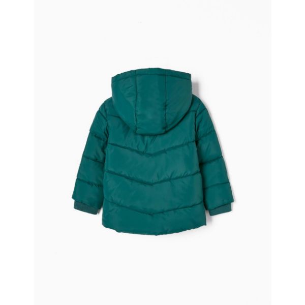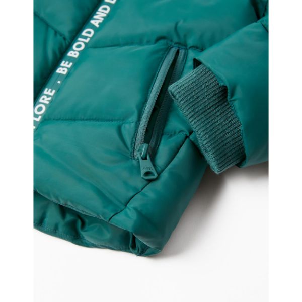 Πράσινο puffer jacket για αγοράκια. Με κουκούλα, ψηλό λαιμό και πολική φλις επένδυση για μεγαλύτερη θερμική άνεση. Πλαϊνές τσέπες με φερμουάρ. Μανσέτες με ραβδώσεις για τέλεια εφαρμογή. Εύκολο κούμπωμα με σφραγισμένο φερμουάρ και κείμενο σε αντίθεση. Εσωτερική ετικέτα για την ταυτότητα του παιδιού. Ένα ζεστό και άνετο μπουφάν για να προστατεύει τα παιδιά από το κρύο και τη βροχή.