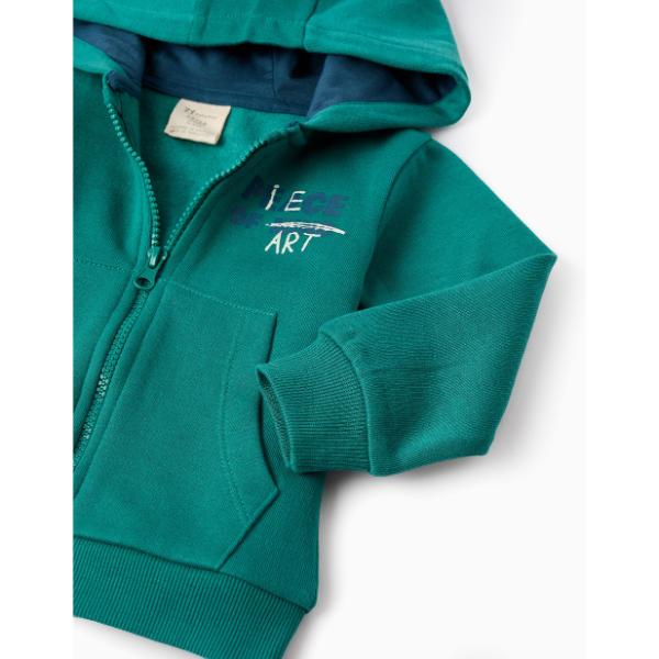 Σετ τριών τεμαχίων για βρεφικό αγόρι. Αποτελείται από ζακέτα με φερμουάρ, με τσέπη καγκουρό και στάμπα στο στήθος. Ένα μπλουζάκι από 100% βαμβάκι με στάμπα. και ένα παντελόνι φόρμας με βουρτσισμένο εσωτερικό για μεγαλύτερη θερμική άνεση. Ένα πρακτικό και άνετο σετ.