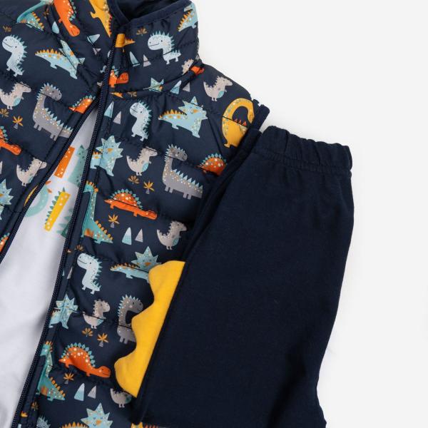Σετ 3 τεμαχίων τζάκετ αμάνικο για αγόρι από 6 έως 24 μηνών, τζάκετ αμάνικο σε μπλε χρώμα με τύπωμα δεινοσαυράκια, μπλούζα με τύπωμα σε λευκό χρώμα, παντελόνι φούτερ σε μπλε  χρώμα με σχέδιο 3D Δεινόσαυρο.