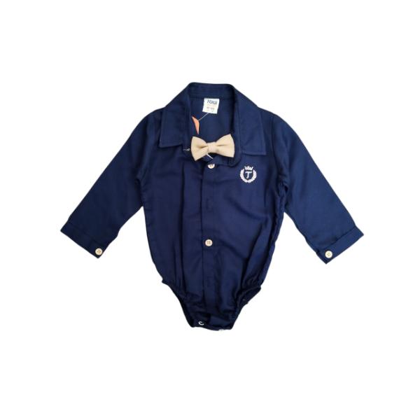 Βρεφικό σετ για αγόρι. Πουκάμισο-κορμάκι σε μπλε χρώμα, κλείνει κάτω με κουμπάκια. Παντελόνι μαλακό, σε μπεζ χρώμα με εσωτερικά κουμπάκια ρύθμισης. Το σετ περιλαμβάνει τιράντες και παπιγιόν.