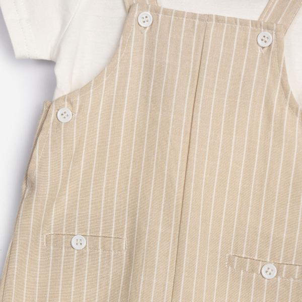 Βρεφική σαλοπέτα σορτς για αγόρι σε μπεζ ριγέ χρώμα, με λευκό κοντομάνικο μπλουζάκι.
