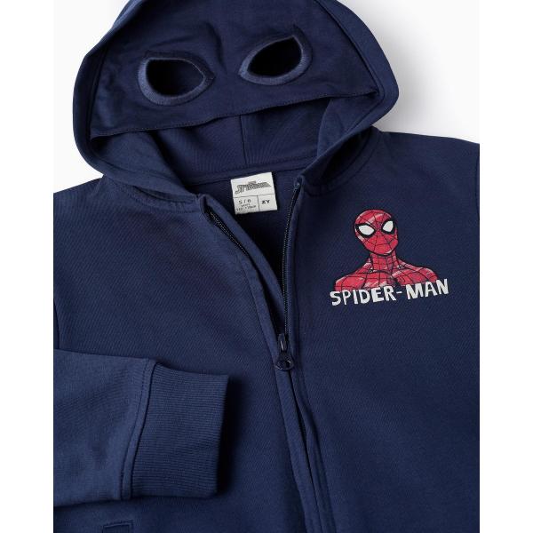 Σκούρη μπλε ζακέτα με κουκούλα για αγόρια, 100% βαμβάκι, με στάμπα Spiderman στο στήθος και την πλάτη. Μανσέτες με ραβδώσεις για τέλεια εφαρμογή. Πλαϊνές τσέπες. Για τους θαυμαστές του Spiderman!